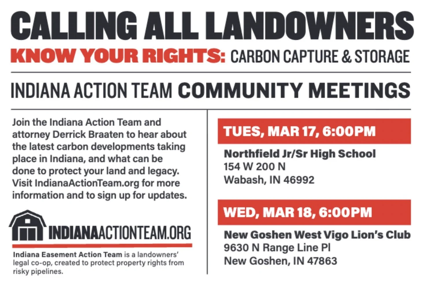 IAT’s number one goal is ensuring Indiana communities are protected from hazardous carbon capture schemes through education, engagement, and action. IAT is a landowner-organized and run group designed to help educate and empower others to understand the options available to you to protect your land, family, and future.